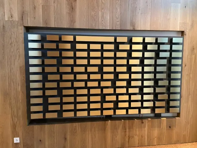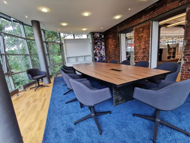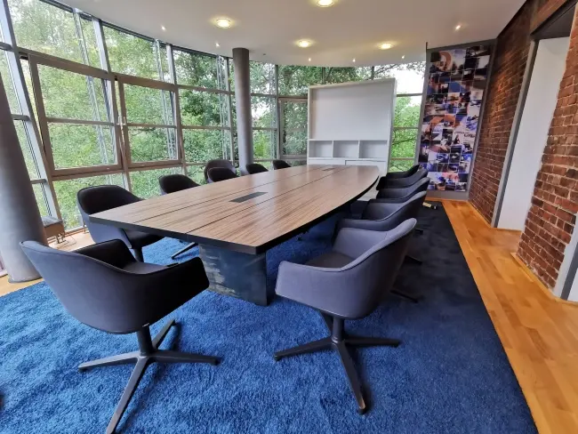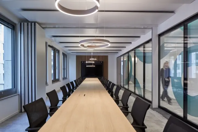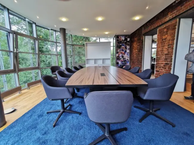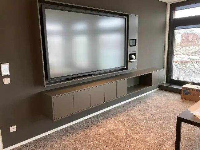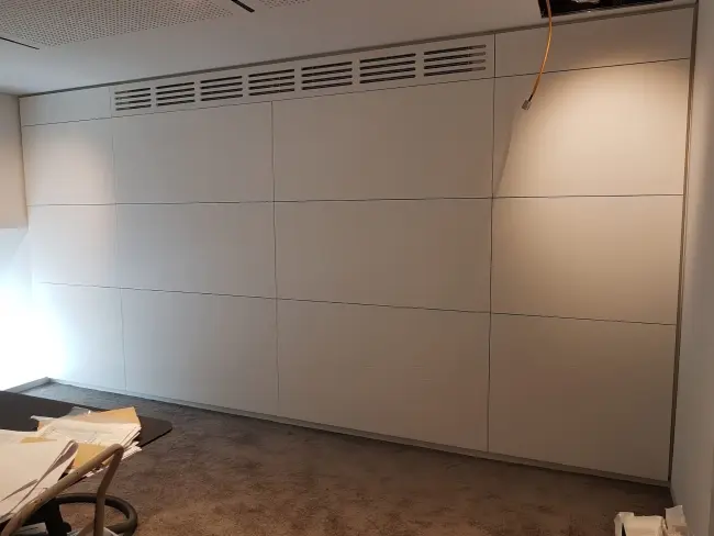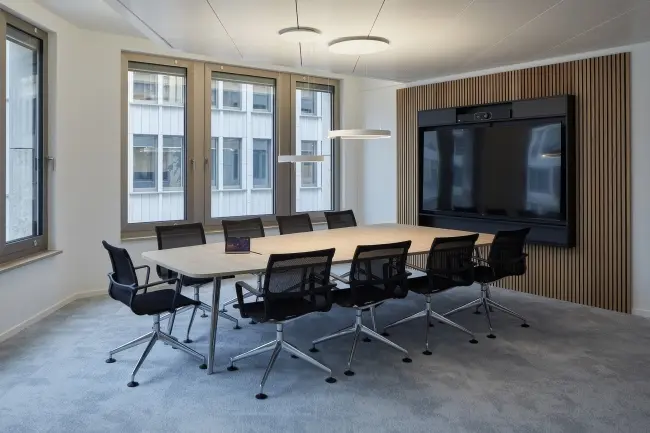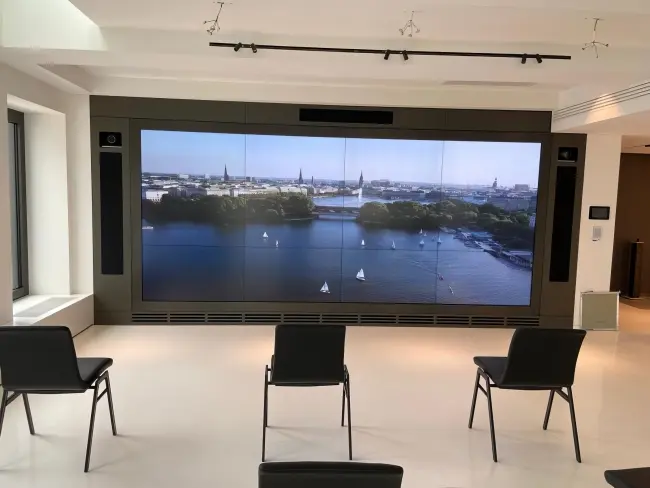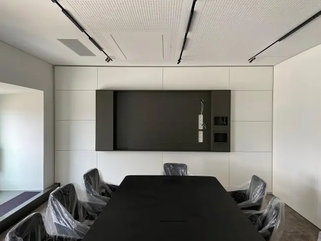 - Medienwände mit integrierter Konferenztechnik, großen Bildschirmen und Akustikpaneelen